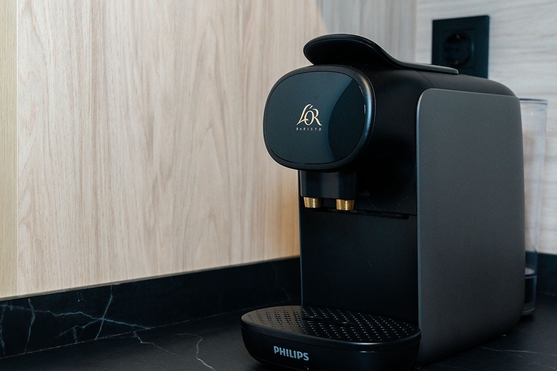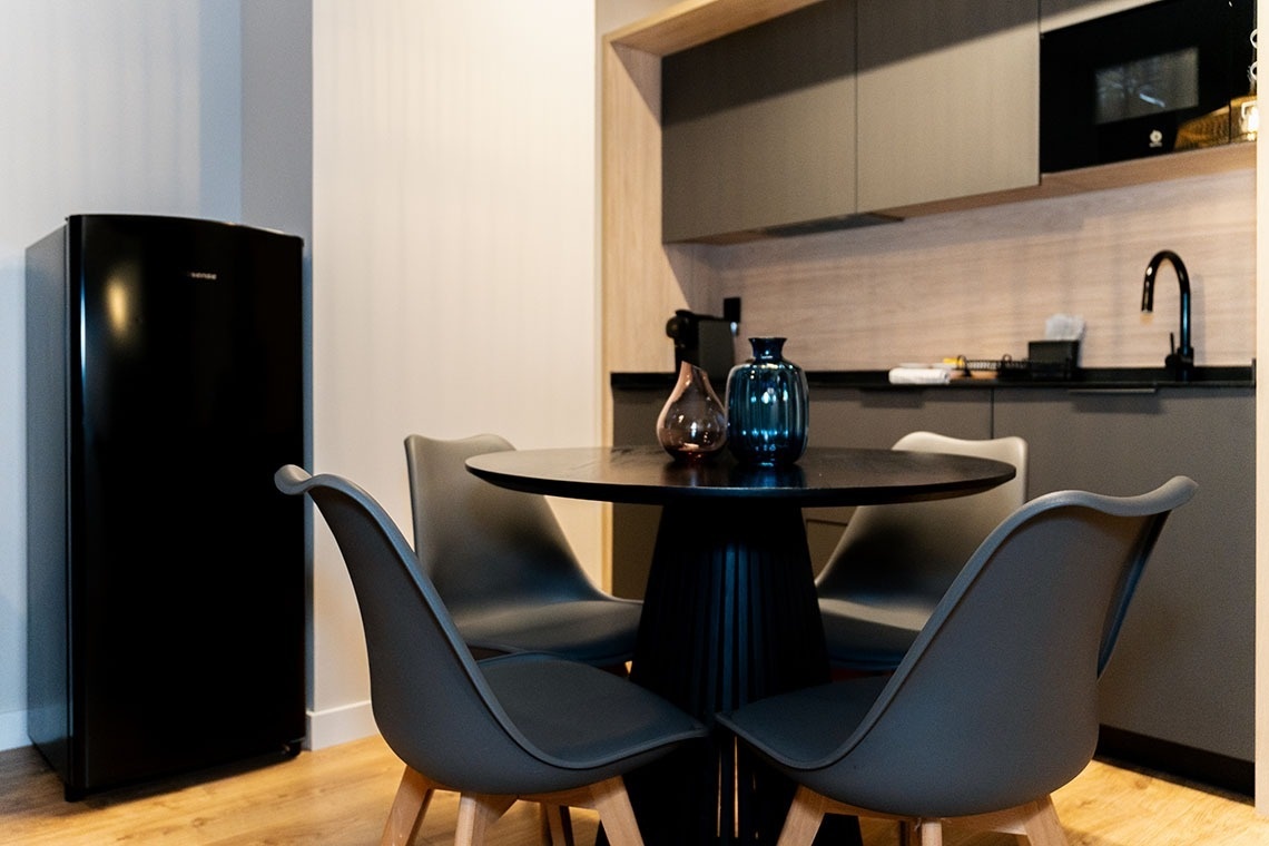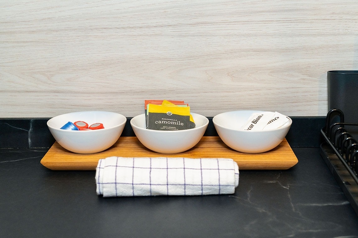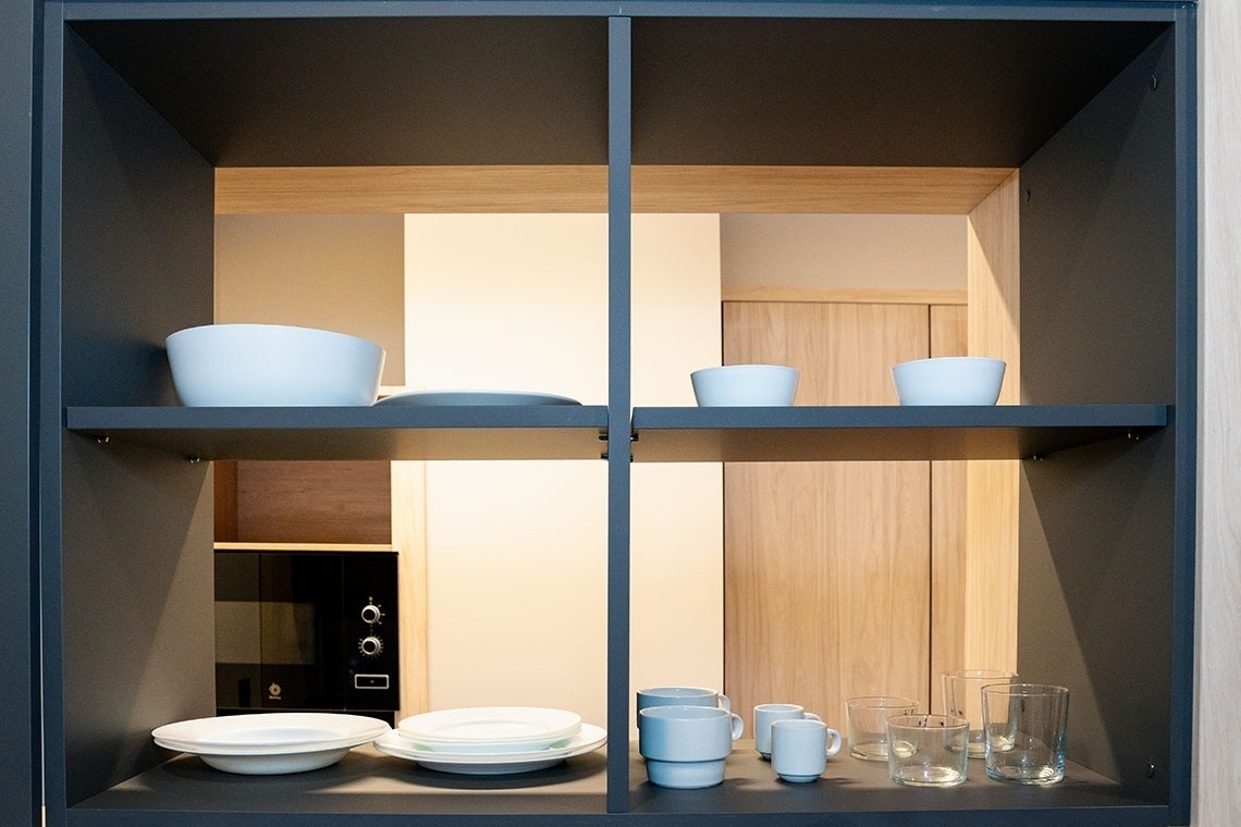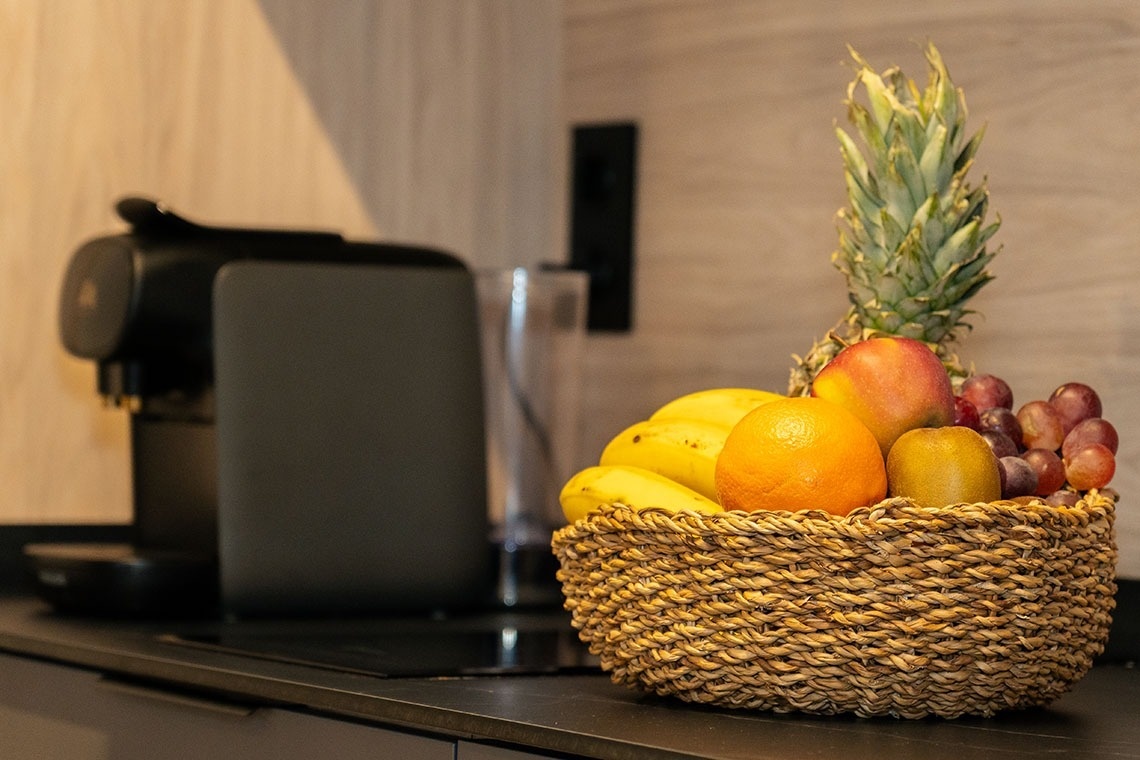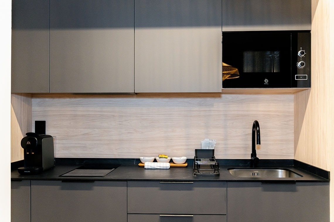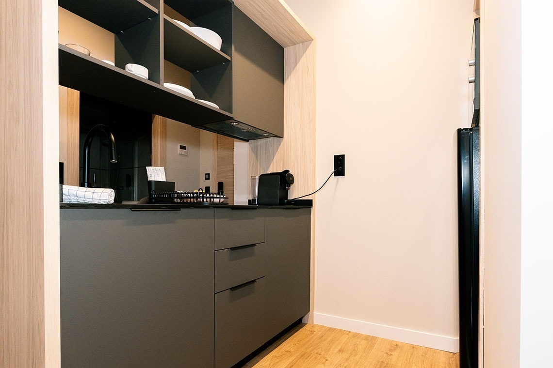 La cocina americana está equipada con vitrocerámica, nevera, microondas, horno, lavavajillas, vajilla/cubertería, utensilios/cocina, cafetera, tostadora y hervidor de agua.